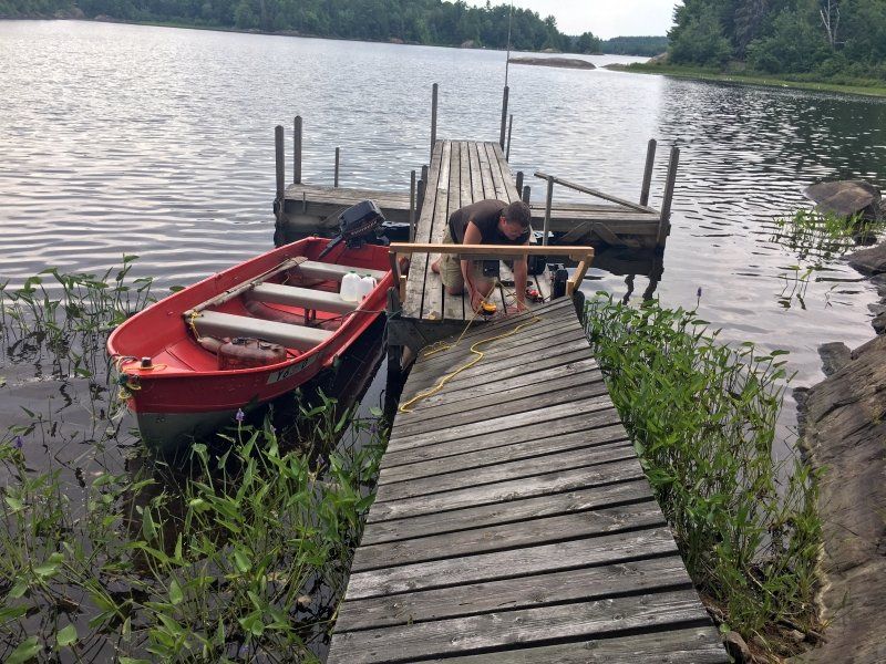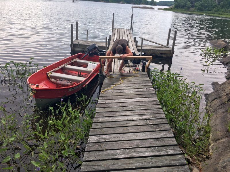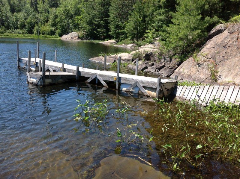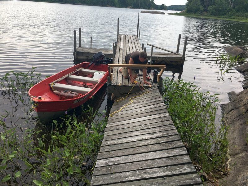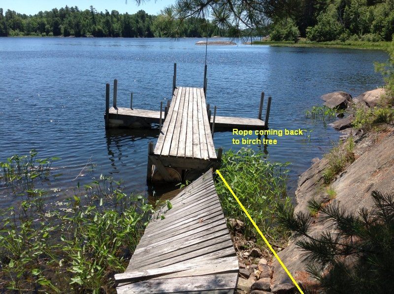 I tied a rope to the dock and used the come-along on a birch tree to pull it in so there is enough overlap for the gangway to stay. This is good because it tightened the cables that go out to sea.